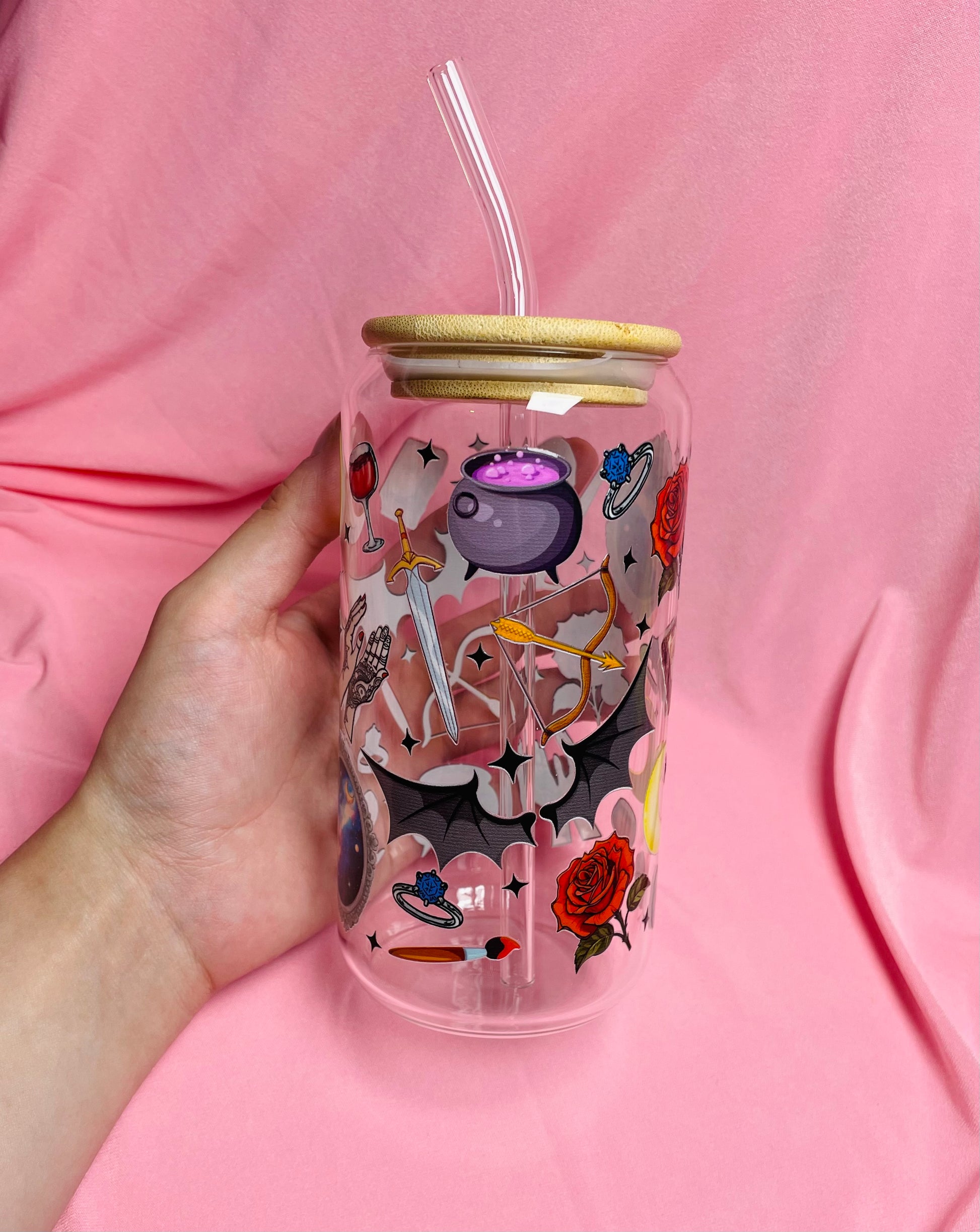 Item is glass, 16oz capacity and with this you will receive a bamboo lid and a glass straw!