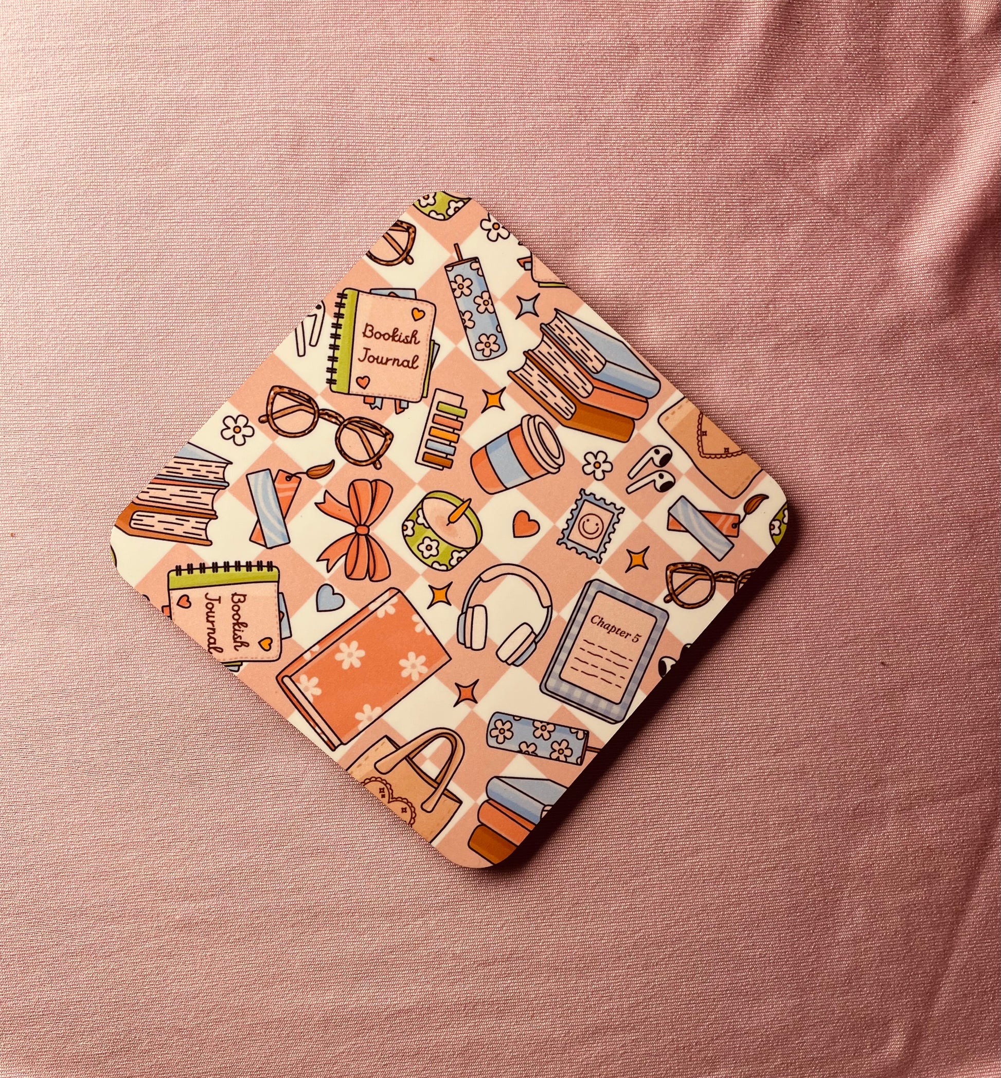 Coasters are made of cork back and MDF material. The size is approx 4x4in/10.2x10.2cm, and thickness is about 0.16in/4mm.