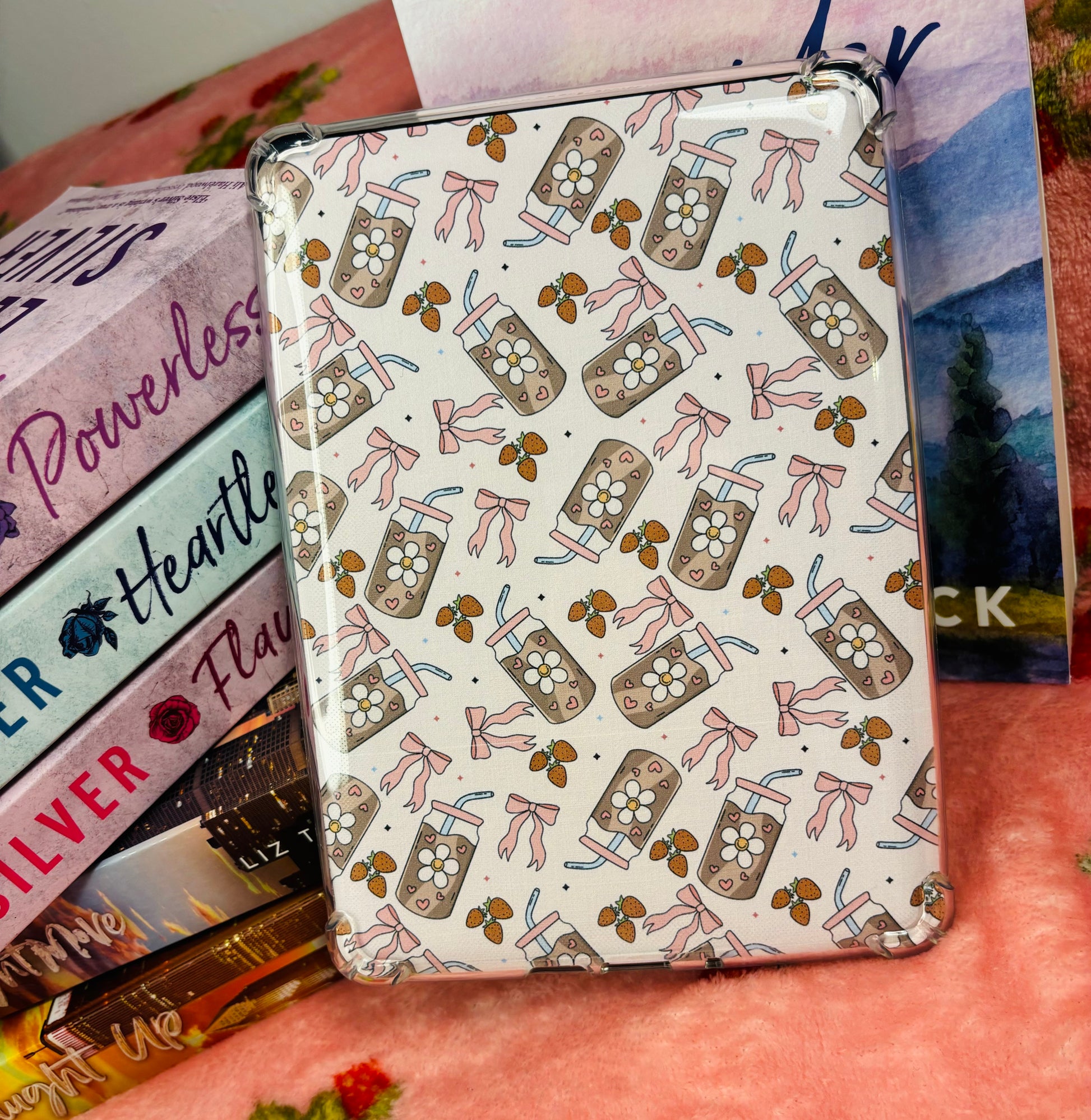 Pink iced coffee and bows kindle insert. Designed to pop straight into your clear case and add a pop of cuteness to your kindle!